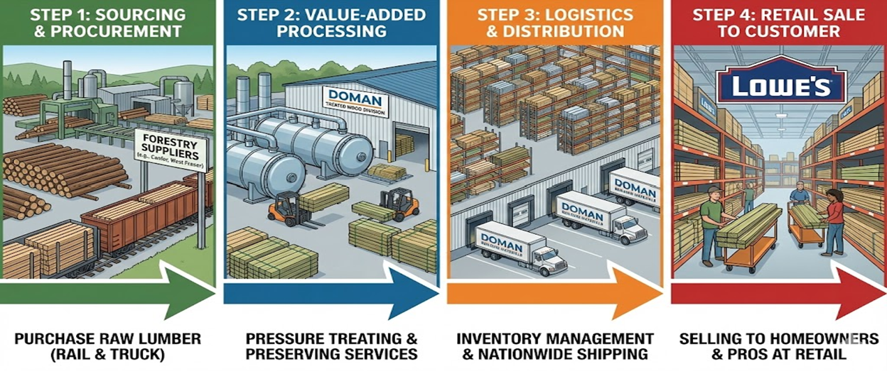 Doman operates on a “price spread” model. Whether lumber prices are sky-high (like in 2021) or depressed (like currently), Doman earns its margin on the volume of wood it moves and the value it adds. Figure 2 highlights its operations in the wood products value chain.