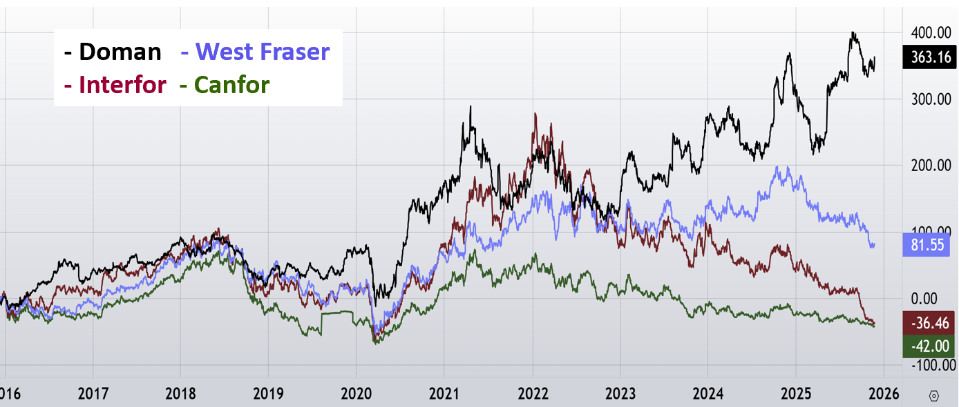 The success of this model and its resilience is visible in the stock’s long-term performance. Looking at the comparative performance chart in Figure 3 below, the black line (Doman) has significantly decoupled from the underlying commodity indices and peer groups (represented by the lagging blue, red, and green lines). While the price of lumber has crashed back to earth from its pandemic highs, dragging pure producer stocks down with it, Doman has continued to compound value.