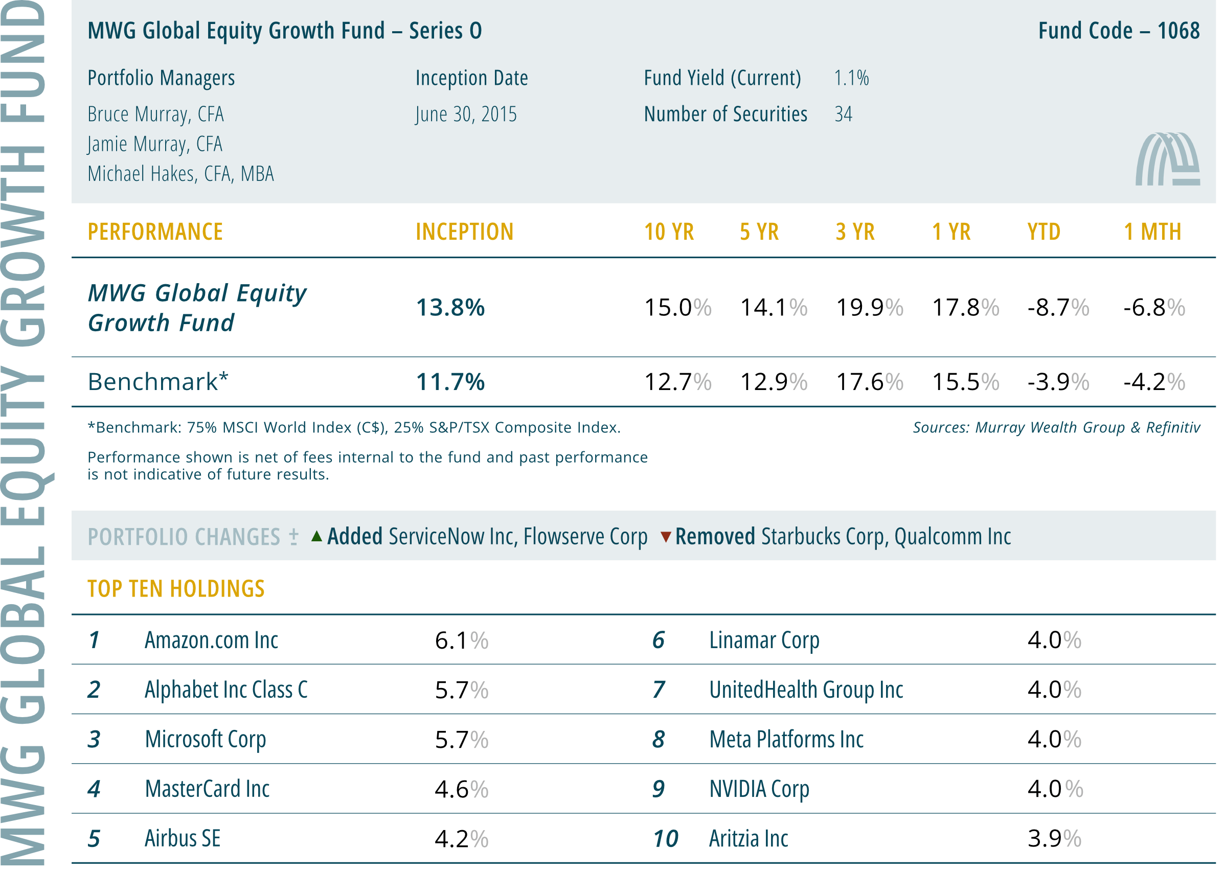 The MWG Global Equity Growth Fund Series O declined 6.8 percent in March, compared to a 4.2 percent decline in the benchmark. The fund was down 8.7 percent year-to-date, compared to a 3.9 percent year-to-date return in the benchmark. Performance was supported by Tourmaline Oil (+5%), Amazon (+1%) and Flowserve (+1%). Detractors included Vital Farms (-31%), Herc Holdings (-27%) and 3i Group (-27%).
