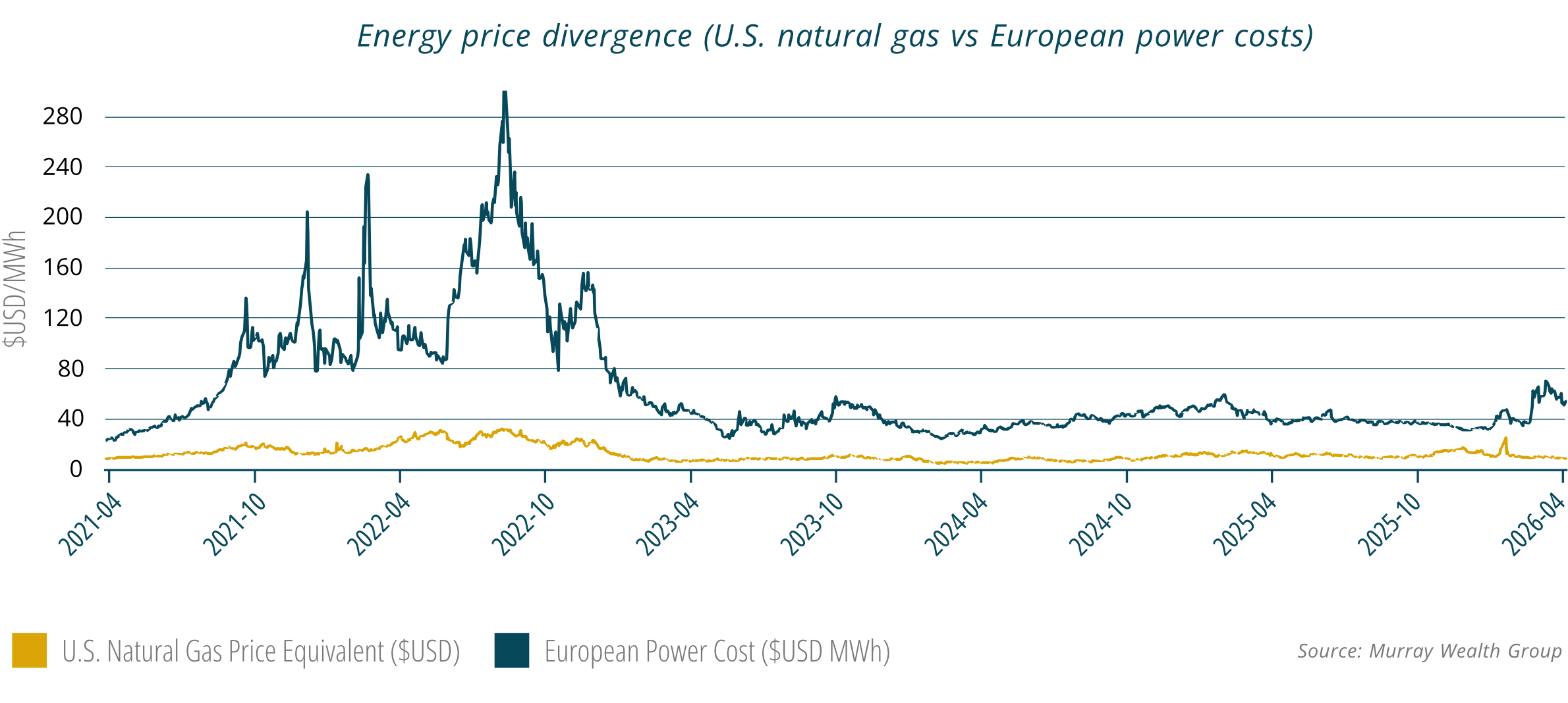 Figure 1. Energy price divergence (U.S. natural gas vs European power costs) highlighting structural supply advantages in North America.