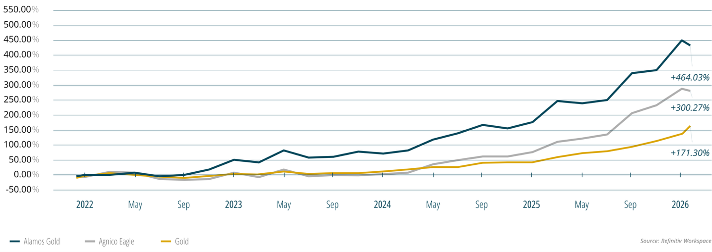 Both companies have performed well as gold prices accelerated beginning in 2023, though Alamos still trades at a relative discount despite possessing several attractive assets and development opportunities.
