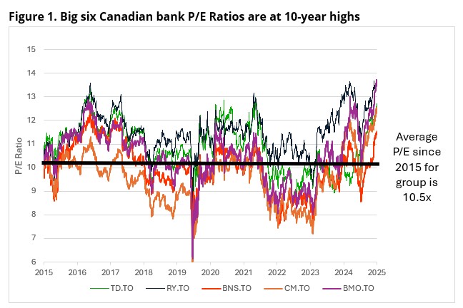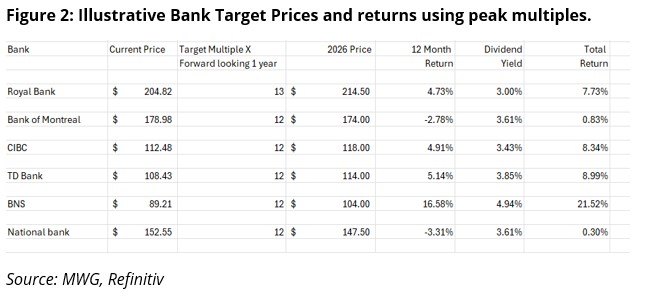 Classic investment theory suggests adding 3-5% to the long bond rate for equity risk in arriving at an appropriate P/E multiple for a stock. Thus, with the Canadian banks currently selling at 12x eps or higher (suggesting 8% discount rates), we are approaching fully valued territory. We recently updated our target prices and based on 2027 eps and using a 12x P/E multiple (13x for RBC as Canada’s premier bank, which may or may not be deserved), there is little room for further substantial price appreciation. National Bank’s acquisition of Canadian Western Bank may also allow for a better P/E as Alberta has the most obvious growth opportunities as hydrocarbon export facilities allow for higher volumes and better pricing for oil and gas producers.