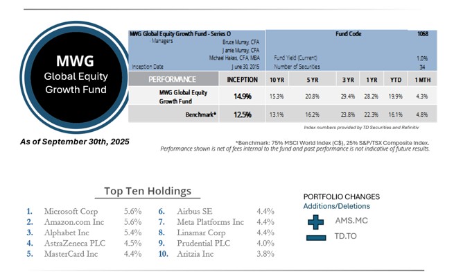 The MWG Global Equity Growth Fund Series O rose 4.3% in September, slightly behind the 4.8% rise in its benchmark, and is now up 19.9% year to date. The Fund’s top three performers in the month were Hudbay Minerals (+29%), Major Drilling (+20%) and Alphabet (+16%), while Docebo (-11%), lululemon (-10%) and Air Canada (-10%) were the largest detractors.