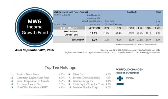 The MWG Income Growth Fund Series O increased 4.3% in September, below the 5.3% return for its benchmark. The Fund is up 17.1% year-to-date. Kingfisher (+21%), Capital Power (+15%) and Pembina Pipeline (+10%) were the top performers, while Doman Building Material (-5%), BP (-1%) and Pro REIT (flat) were the top detractors. The Fund’s yield was 5.5% at month-end.