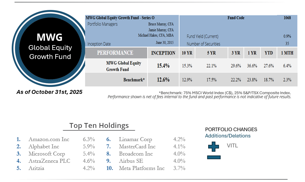 The MWG Global Equity Growth Fund Series O rose 6.4% in October, beating the 2.3% rise in its benchmark, and is now up 27.6% year to date. The Fund’s top three performers in the month were Hammond Power Solutions (+73%), Herc Holdings (+23%) and Thermo Fisher Scientific (+18%), while Meta (-11%), Docebo (-7%) and Aon (-4%) were the largest detractors.